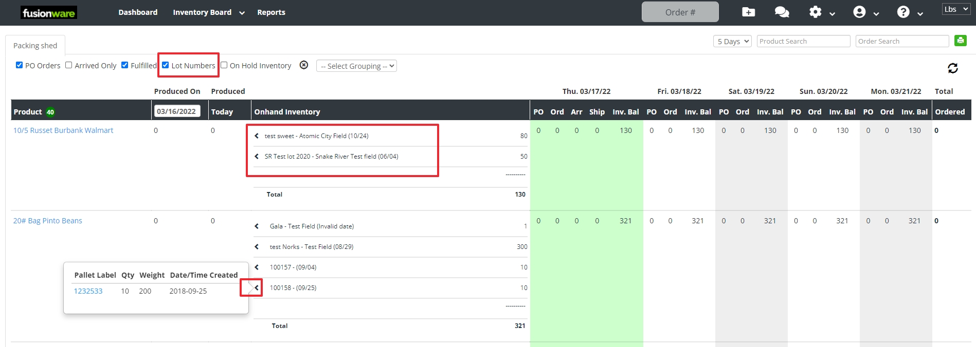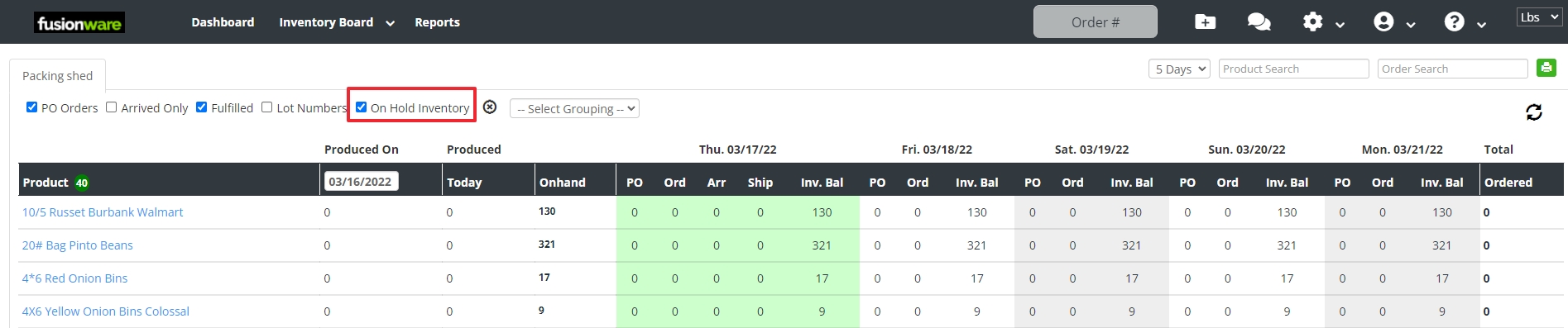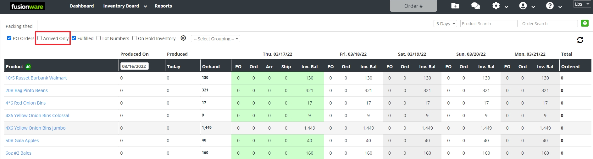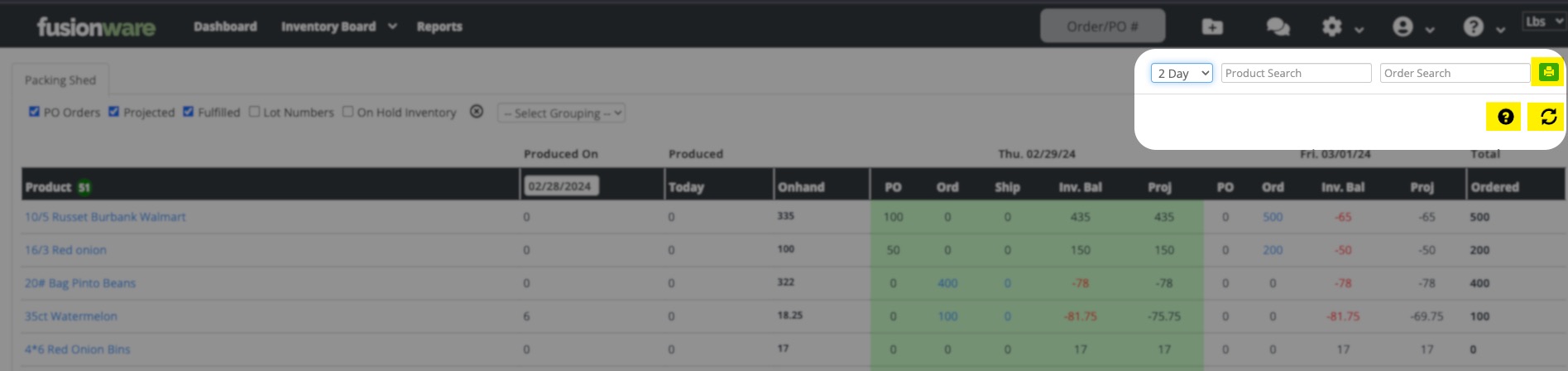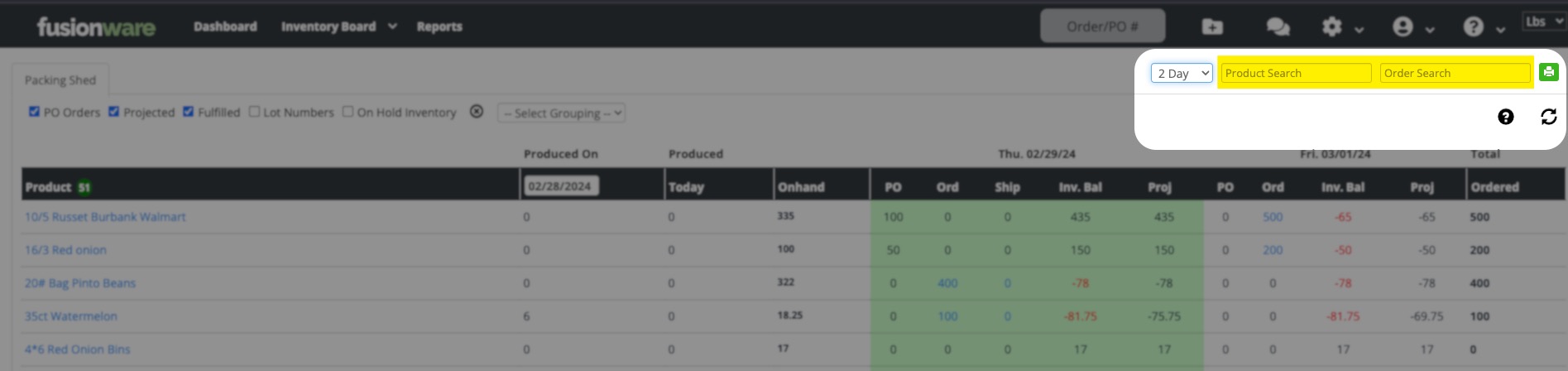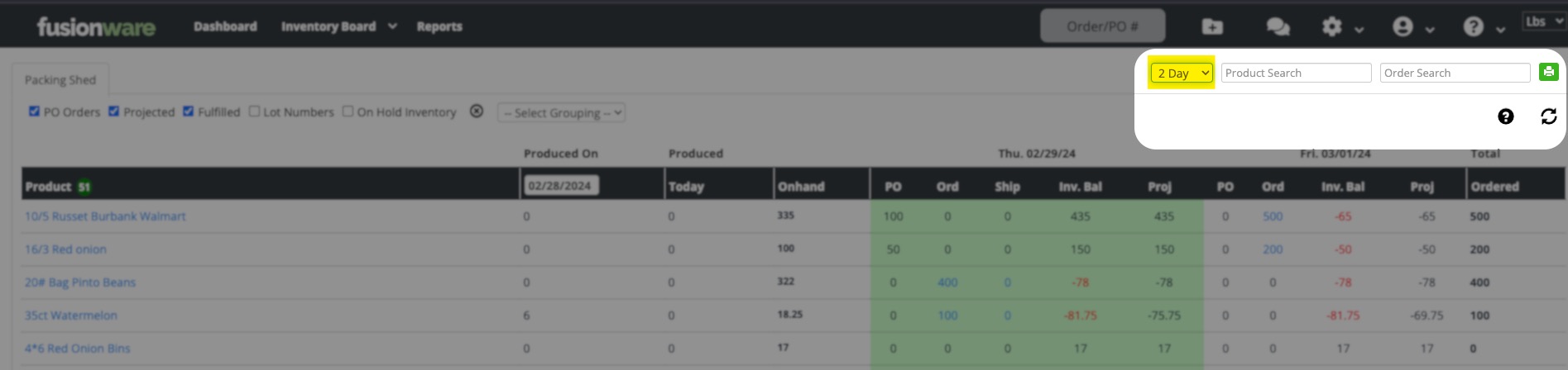 The Inv. Bal (Inventory Balance) column takes the Onhand inventory amount plus the amount coming in on the PO, minus the Ord and Ship amounts. For 02/29/24 you can see the totals that are in the black, indicating there is enough product to fulfill the orders for that day for that product. The negative numbers in red show how much product is required for that day to fulfill the orders shipping on that day. There is enough product to fulfill the orders for 02/29/24 for the 10⁄5 Russets and 16⁄3 Red Onions. However, for Friday 03/01/24 there are additional orders that put the product inventory into the red. To expand the number of days (up to 7 days ahead) select the number of days you would like to see projected in the dropdown at the top of the screen.