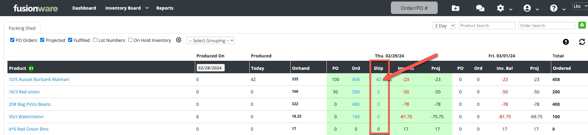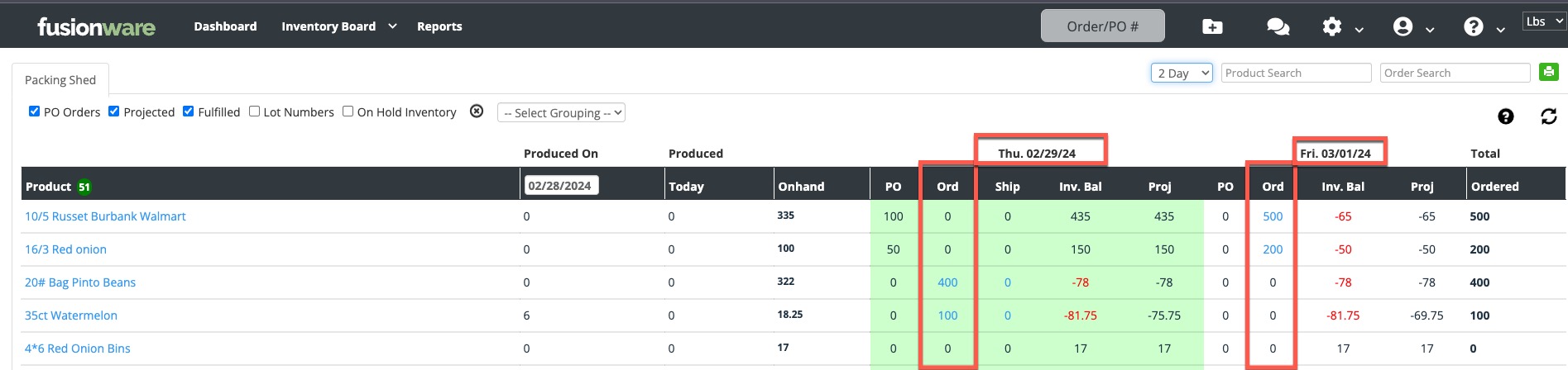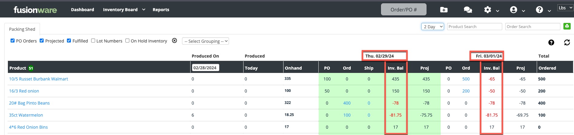 | Inv. Bal | The Inv. Bal (Inventory Balance) column takes the Onhand inventory amount plus the amount coming in on the PO, minus the Ord and Ship amounts. For 02/29/24 you can see the totals that are in the black, indicating there is enough product to fulfill the orders for that day for that product. The negative numbers in red show how much product is required for that day to fulfill the orders shipping on that day. There is enough product to fulfill the orders for 02/29/24 for the 10⁄5 Russets and 16⁄3 Red Onions. However, for Friday 03/01/24 there are additional orders that put the product inventory into the red. To expand the number of days (up to 7 days ahead) select the number of days you would like to see projected in the dropdown at the top of the screen. |
