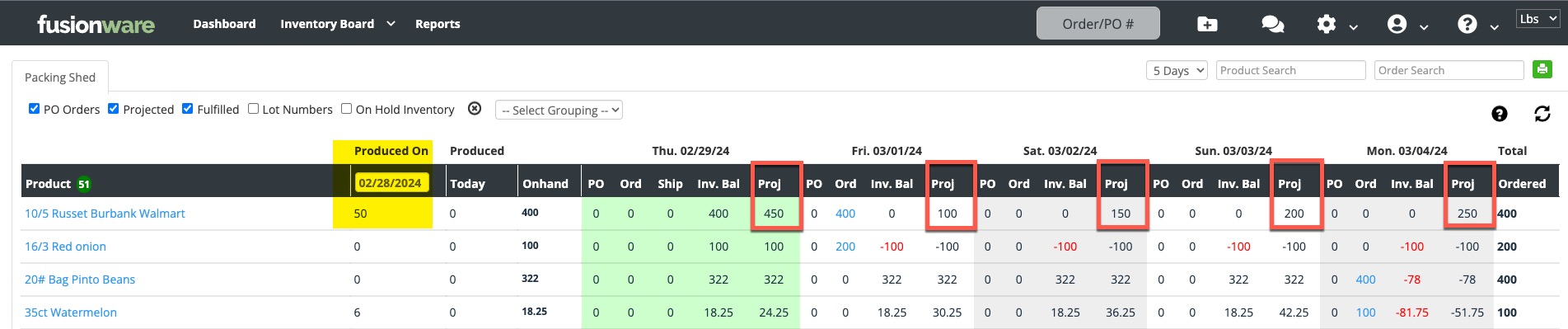 | “Proj” Projected | The Proj (Projected) column is a production estimation that allows you to select any day you produced products and project out what that will do for your upcoming week if you produce that same amount each day. In this example, the Produced On is set for a day that the 10⁄5 Russets produced 50 units. It then is projected that you are going to produce that same amount for today. It is then added to your current inventory totals for today in the Proj column. Every day of the week the Projection is that you will produce 50 units of that product every day and it is then added to the Proj total. If there are orders shipping on that day it will deduct those totals from the projected amount. This will help you to estimate how much of each product you will need each day based on a previous day that you ran. It can be especially helpful to use the “Select Grouping” to group similar sized products together. An example here would be to group all your 10⁄5 Russets, instead of just the Walmart label, to project what you can produce for all your 10⁄5 labels. |