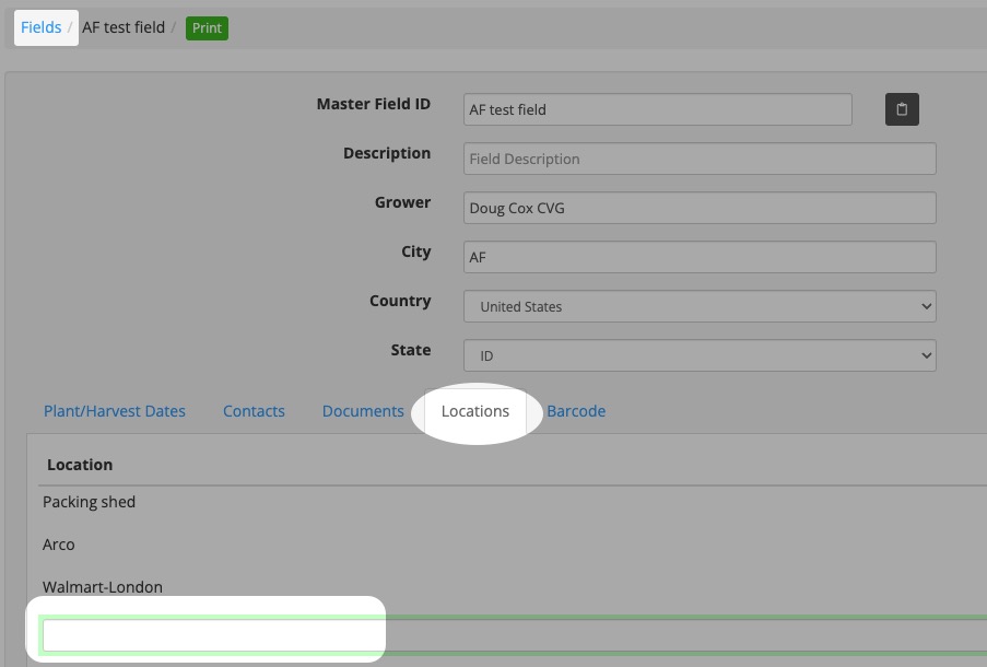 | 2. Field Locations | For each lot you want to manually have access to select, you need to go into the Locations tab of its Master Field and add the shed location you are packing at. |