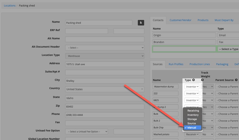 | 3. Shed Location | In your Shed Location you are packing at, select the source you want to be a manual lot selection and change its Type to “Manual”. Add that Source to a Production Line. |