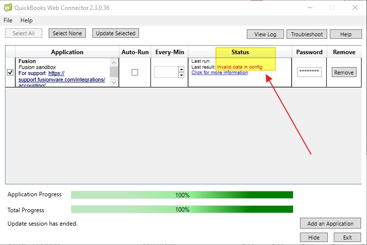 | 3 of 4 The account name does not match between Fusionware and QuickBooks. Correct the name and save. Select the Re-Send button in the Adapter Summary and then Re-run the Web Connector | ![]() |