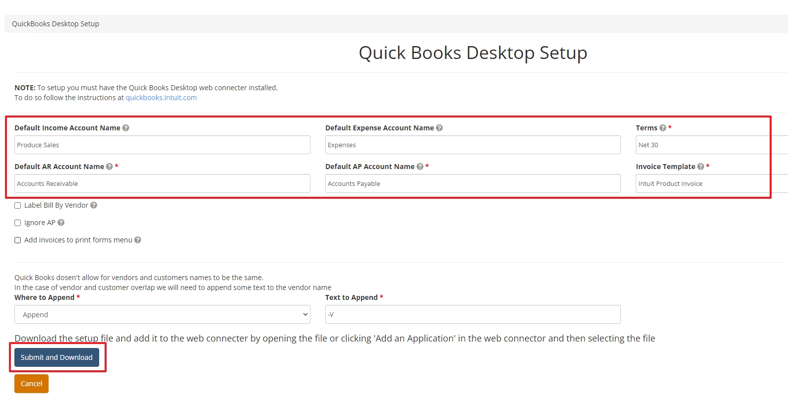 | 3 of 12 Input QuickBooks Account Names and Info. Select “Submit and Download” to Proceed | ![]() |