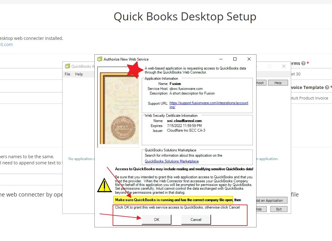 | 7 of 12 Make Sure QuickBooks is Running in the Admin login and Select Ok to Authorize New Web Service | ![]() |