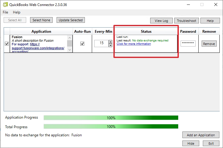| Example Status: If the status “No data exchange required” appears that means there is nothing in the Adapter Queue to send to QuickBooks. An Order must be in “Invoice” status to go into the Adapter Queue | ![]() |