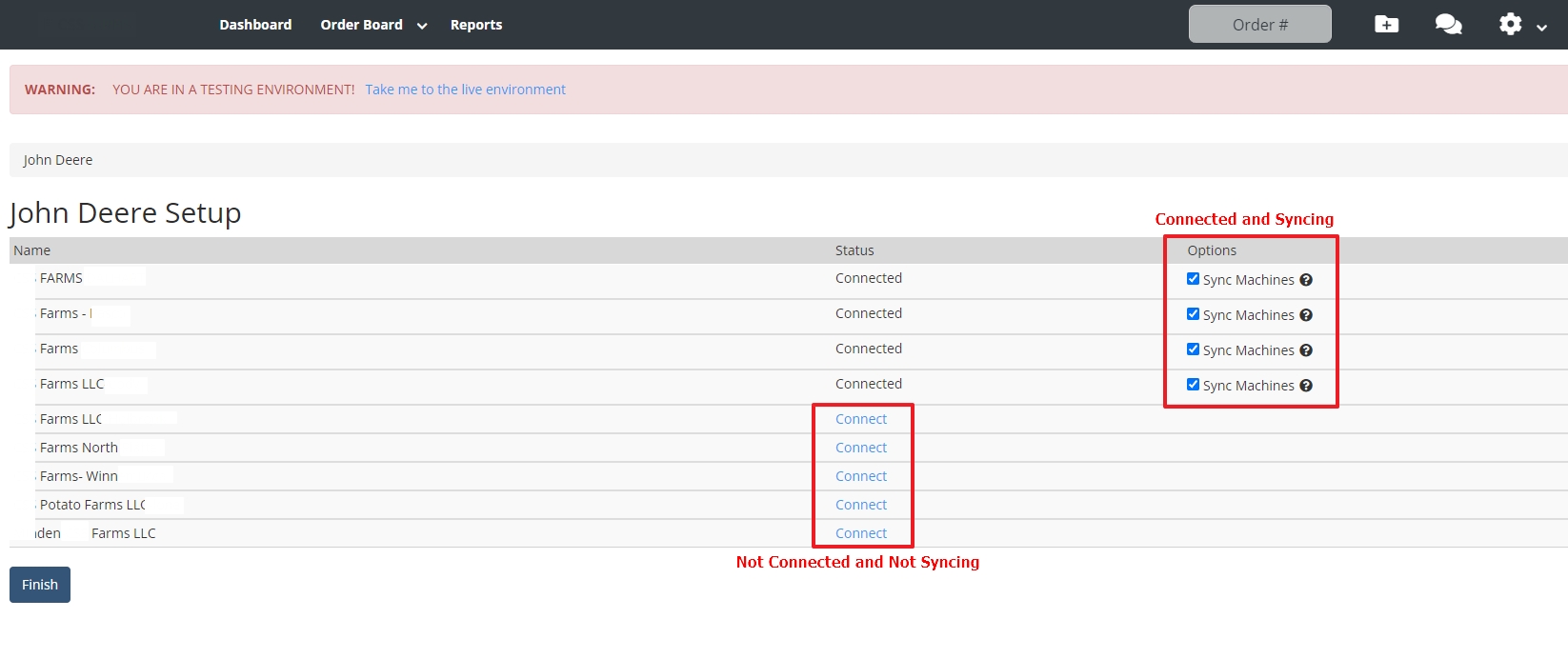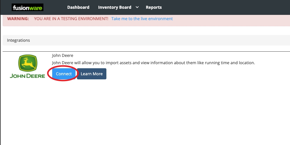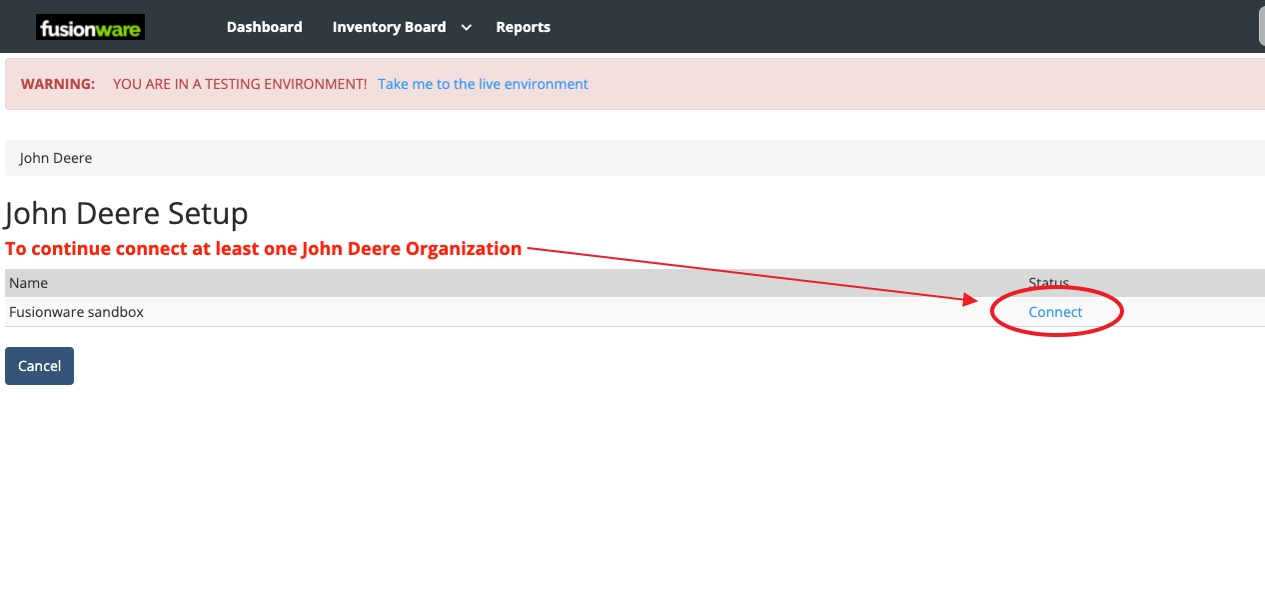 | 6 of 10 Select the “Connect” button in the status column to connect each John Deere organization you want to sync with Fusionware | ![]() |