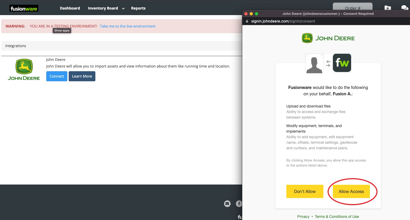 | 5 of 10 Select the “Allow Access” button in the John Deere pop-up | ![]() |