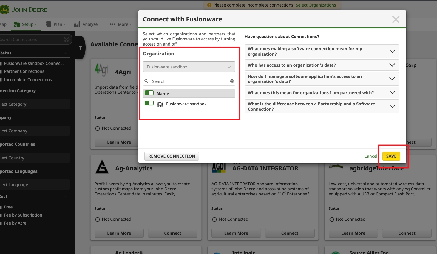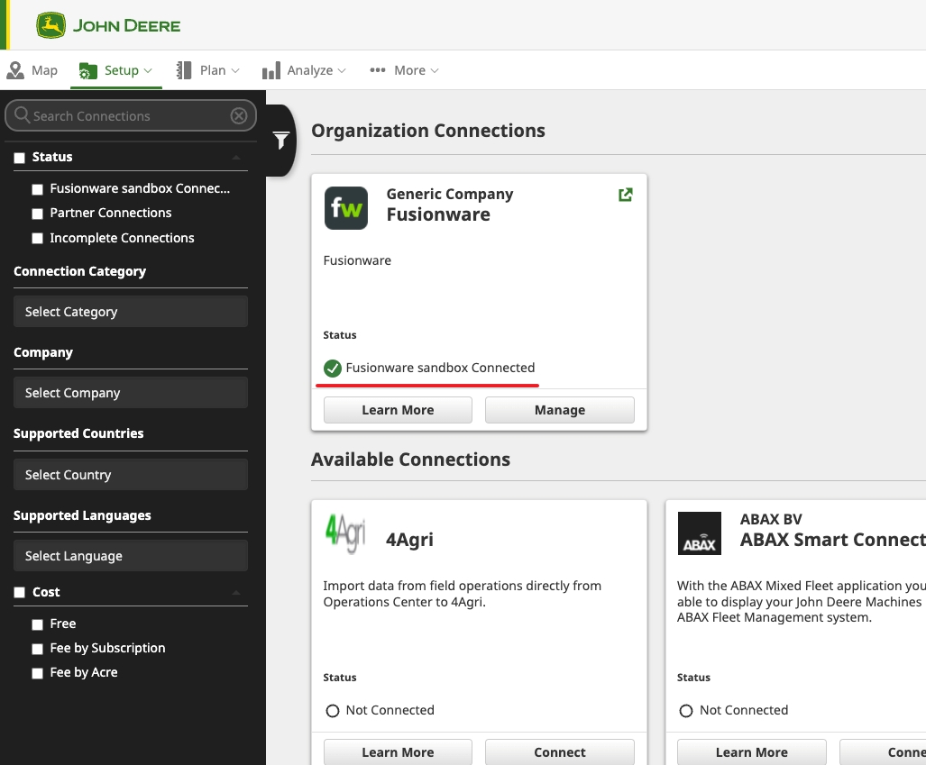| 8 of 10 Verify that your organization is connected to Fusionware in the John Deere profile | ![]() |