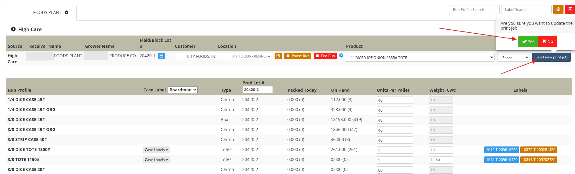 Select the “Send new print job” button and then press the “Yes” green button. The print job is sent to the label printer and will print and apply this label until it is changed.  |