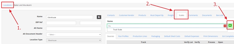 | Location Scale Setup: (1) Go to Locations and select the Destination with a scale. (2) Select the Scales tab. (3) Select the scale add with the green plus. |