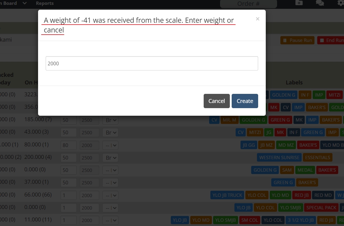 | On The Production Board: When creating inventory it will create inventory with weight from the scale. If the weight on the scale is 0 or negative you will have the option to enter the weight manually |