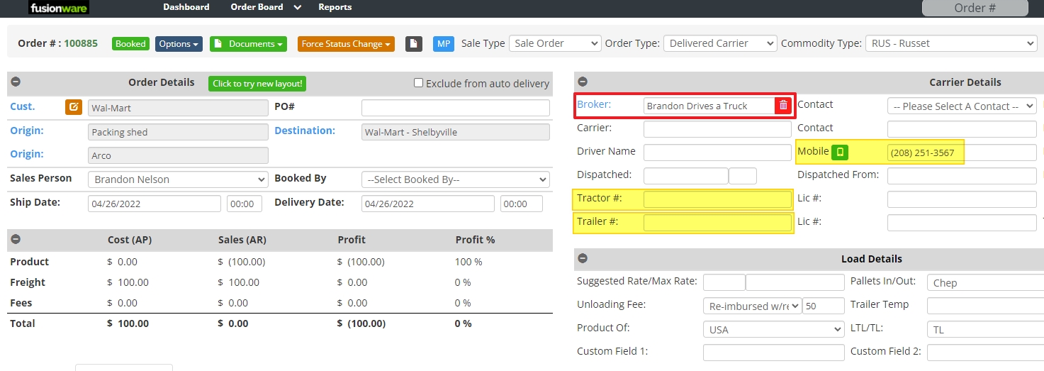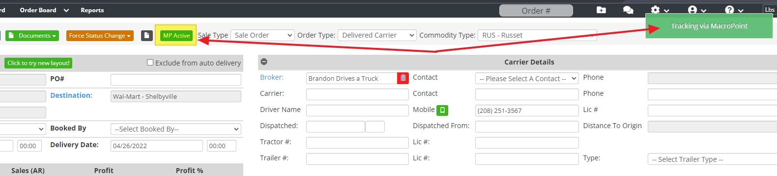 | Order Carrier Information | Add a Broker/Carrier inside an order and you must enter driver information of Mobile #, Tractor #, or Trailer # ![]() |