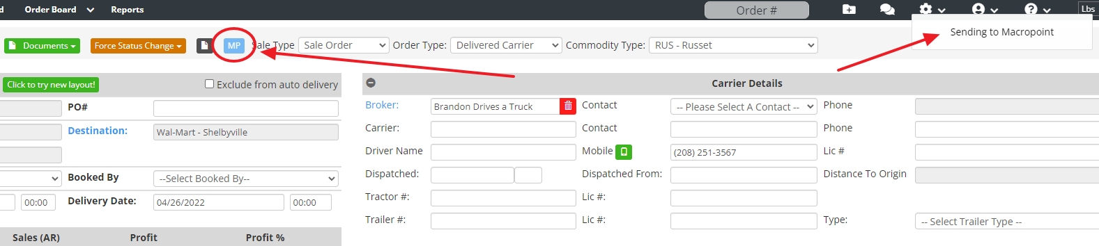 | Select MP In The Order | Sending to MacroPoint notification will appear ![]() |