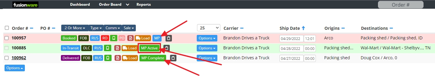 | The 3 MacroPoint Statuses | MP & blue when not active, MP Active & green when active and prior to delivery, MP Complete when load marked as Delivered ![]() |