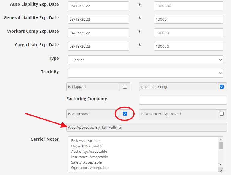 | Approved Carriers | AFTER A CARRIER HAS BEEN PULLED IN FROM MY CARRIER PACKETS, THEY MUST BE MARKED APPROVED TO ADD TO AN ORDER The “Is Flagged” must be unchecked as well. The User that checked “Approved” will be recorded. ![]() |